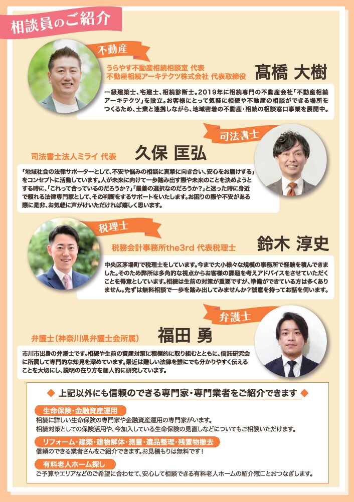 なお、本相談会は、司法書士久保匡弘先生、弁護士福田勇先生、一級建築士髙橋大樹先生との共催です。